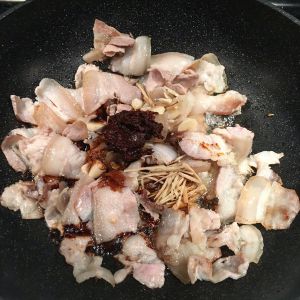 锅内加入切好的五花肉片,依次加入两勺豆瓣酱