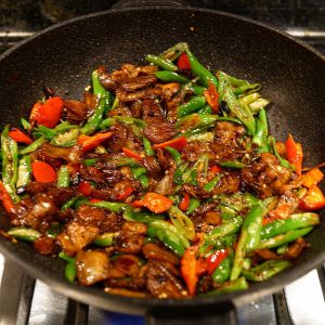 大火加入肉片爆炒,加入一半青椒,再放老抽生抽,胡椒粉
