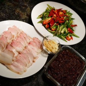 煸炒到肉片呈凹进去的造型,放入姜蒜 老抽 郫县豆瓣酱,一点点点糖,提味用。
