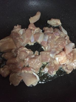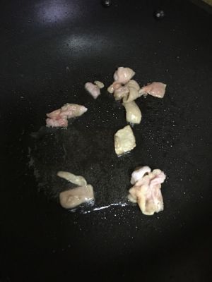 锅内放油,待油温六、七成热,下入鸡丁划散,待变色后盛出。