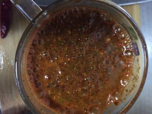 如锅内还有少量油,则不用再加油,若无油了需加入少量底油,下放干辣椒,郫县豆瓣酱,炒出红油,放葱,蒜煸炒片刻后,倒入鸡丁,胡萝卜丁。
