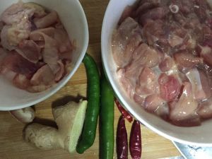首先 切好鸡肉 用酱油 生粉调味 码五分钟