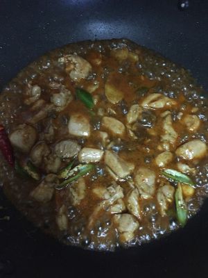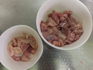 将鸡腿肉去骨去皮,鸡腿肉切块.用腌制料腌好.鸡皮用来爆油.