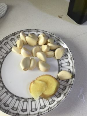 鸡腿三个,干辣椒15g,花椒6g,香叶1片,八角2个,葱白2个,蒜一整头,姜3片备用。
