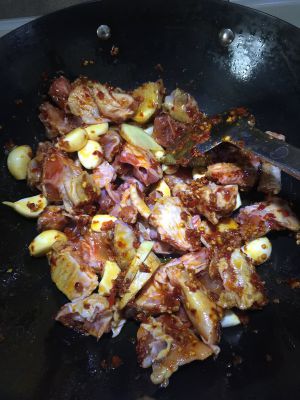 放入鸡块,姜,蒜 大火翻炒。注意不要胡锅