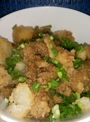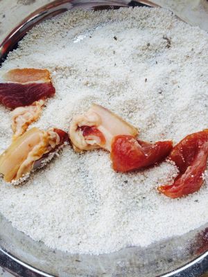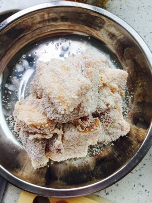 锅洗干净,仍然是小火,锅热后放少量油,待油七成热时,一块一块下肉,移动炒锅,煎至金黄关火,夹出煎好的肉。剩下没用完的米粉,用水拌匀后铺在边上