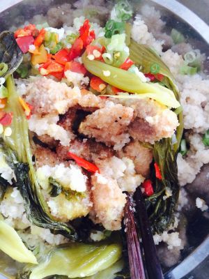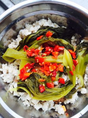 依个人喜好,我在上面铺了点酸菜跟剁辣椒。上蒸锅,大火蒸30分钟即可(如果是压力锅时间可以短一点哦)
