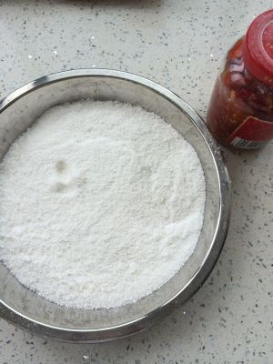 取大概200克大米,用水泡着,得泡好几个小时,到米发白,手指能捏碎了为宜。泡好后捞出,平坦在砧板上稍干水份,待水基本上干了,就可以磨了,就地取材,我是用的剁辣椒的玻璃瓶,只要是圆桶形的,能使上劲儿的都可以,接下来就是漫长的磨米时间,可以来电小音乐呢!忘拍照了…