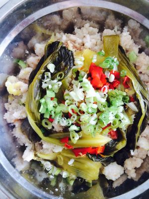 拌好之后我把里面的大葱挑了出来,因为蒸熟之后葱会绵软的不成型,没办法挑出来,但搅在里面会出现丝感觉不太好。就把葱挑出来插在表面,这样蒸熟之后就可以直接把葱挑出来扔了。