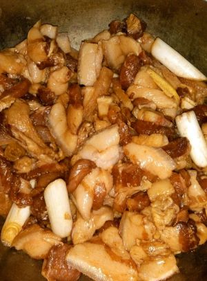 腌肉,(我这个只腌了1个小时),如果时间够可以多腌一会儿。腌肉里面放了料酒,大葱,姜片,生抽老抽,还有郫县豆瓣酱。