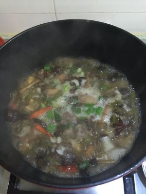 锅烧热放少许油,五成热放入泡椒、干辣椒、大蒜、老姜酸萝卜炒出香味