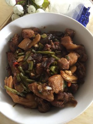 倒入酱油,大蒜叶,啤酒煮到只留一点点汤汁。