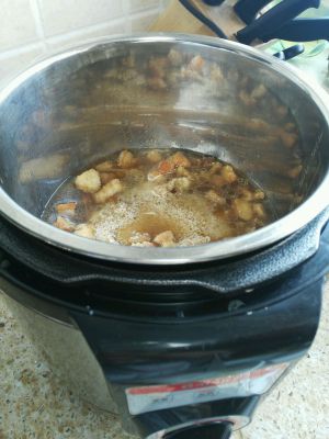 把大碗里的蒸肉米粉和水一块倒入高压锅里。