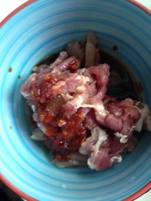瘦肉切丝加豆瓣酱,生抽,盐调匀。四川人肉里是少不了豆瓣酱的