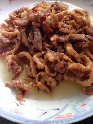 瘦肉翻炒片刻,加糖醋盐翻炒半分钟左右出锅