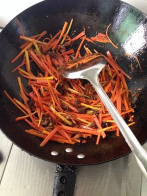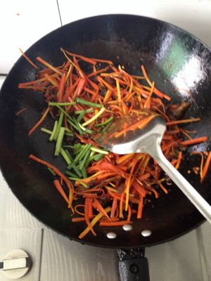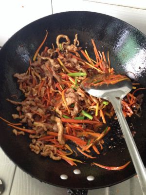 依次放入胡萝卜及茭白丝翻炒至软后,再加入香菇,青椒,最后加入大葱及肉丝,