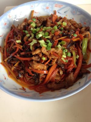 加老抽糖醋少量水加肉丝翻炒片刻起锅装盘洒上葱花。