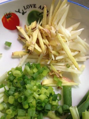 生姜大蒜切丝,葱白葱尾切段,葱中间切成葱花