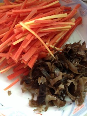 锅里留底油,生姜大蒜爆香,下胡萝卜木耳翻炒2~3分钟