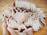 五花肉放凉后(入冷水过凉也可以)切薄片。