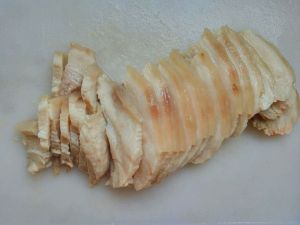 晾凉的肉,切成薄片。热乎的不好切,下次我尝试把肉放冰箱里冻一会再切:)