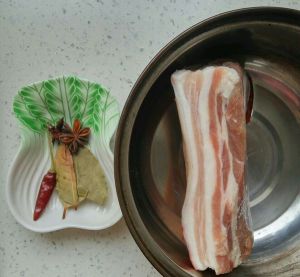 五花肉洗净,香料看自己家里有啥就用啥,凉水下锅,加适量料酒,煮开后继续炖煮至筷子能戳透至肉块一半处,把肉块翻面继续煮几分钟,然后关火闷一会儿,肉能用筷子使劲儿戳透,捞出来,放凉待用。
