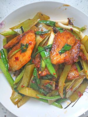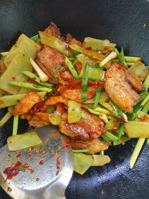 下青笋片和蒜苗段,翻炒至蒜苗断生即可出锅,根据自己口味加少许盐。因为豆瓣酱已经有咸味了。