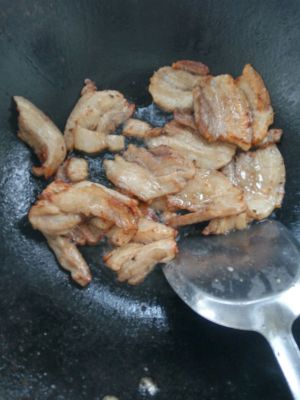 锅内少许油,热油放入姜片,放入五花肉片煸炒。