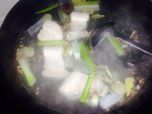 五花肉下凉水锅煮20分钟,煮开后打掉浮沫,加入葱段,姜,大蒜