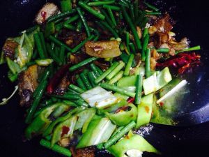 倒入蒜苔青椒翻炒至蒜苔熟
