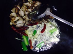 油热熟,下姜蒜煸香倒入五花肉,多煸会儿出油,五花肉成微卷状。(如果油过多,可以倒出一些)