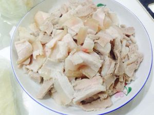 五花肉,加姜,料酒煮熟,约20分。