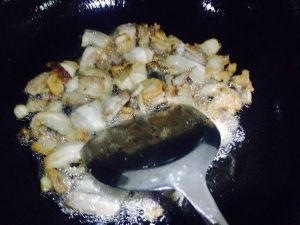 锅里放30g油,烧热后加入肉,煸炒,最好肉成盏窝