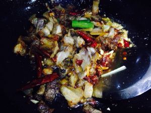 肉拨至锅边,下入花椒,干辣椒,葱姜蒜爆锅,并加入郫县豆瓣酱炒出红油