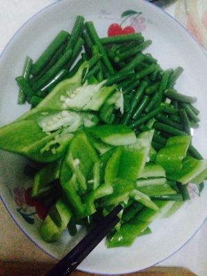 蒜苔、青椒切好备用