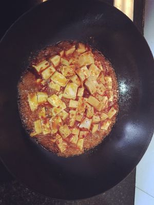 锅内放入半饭碗水,放入油,少许酱油,两勺麻婆豆腐酱。
