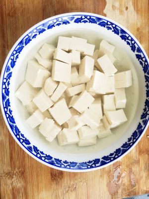 豆腐切小块,用盐水浸泡5分钟左右,可以去豆腐的生味。
