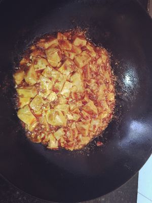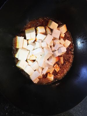 翻炒一下豆腐(需轻轻翻动)使汤汁融入豆腐