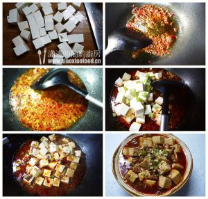 烧热锅加入油,再加入酱油,姜,蒜,辣椒,花椒,豆瓣和豆豉,炒香后加入少量开水或者骨头汤调制佐料。再加入待用的豆腐和少许料酒,微火煮1分钟,尽量少动锅中豆腐怕变形,加入牛肉细末再煮2分钟,最后勾芡,就可以起锅了~根据个人口味还可加入鸡精,盐和白糖。起锅的豆腐再散上香葱末就大功告成啦!~
