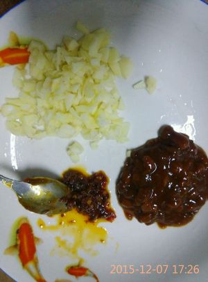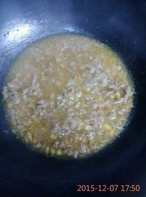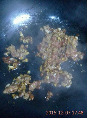 冷锅热油,爆香蒜沫后,依次加入辣椒酱,豆瓣酱,肉沫翻炒。