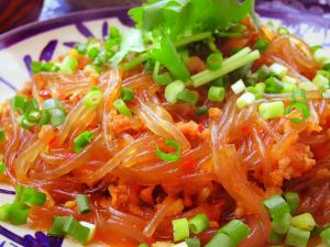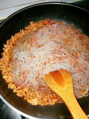 锅内到入油,将和好的肉末翻炒好加入提前泡好的粉丝,翻炒后加入酱油,味精,少许盐,蚝油,芝麻油翻炒即可起锅,盛盘后撒上葱花即可
