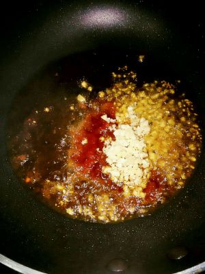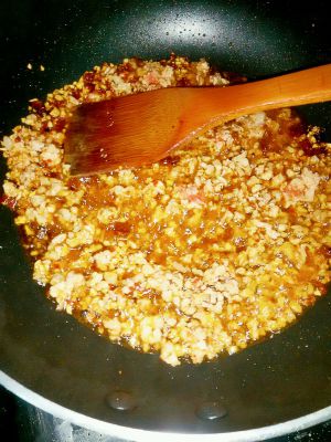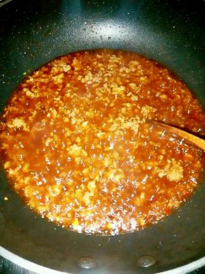 爆香蒜蓉姜蓉,下肉末跟豆瓣酱翻炒,再放酱油。