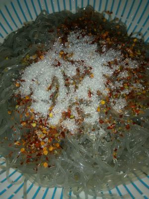 红薯粉条用开水浸泡15分钟!剪短,沥干,撒花椒粉,辣椒粉,白糖!