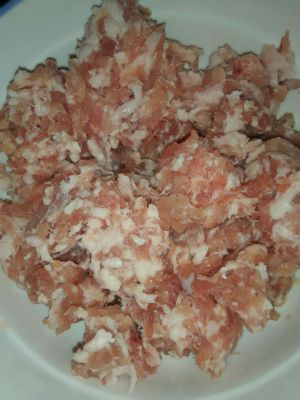 吃剩下的五花肉若干块,切碎。热油锅,放入葱姜蒜爆炒,加入五花肉沫。