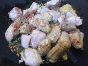 起油锅,油稍稍多一些,把鸡块放入煸炒,将鸡肉里的水分炒出,炒至干香, 盛出。