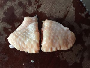 1.鸡腿肉剁成小块、用料酒和鸡粉腌制片刻备用。