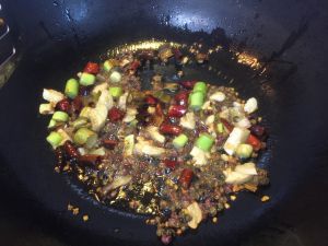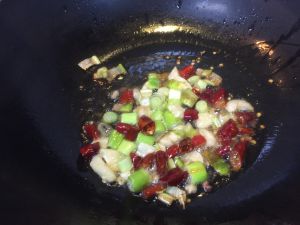 喜欢辣的朋友可以多放辣椒段.辣椒段.麻椒煸炒.出香味.放葱.姜丝.蒜片.鸡丁下锅.调味.