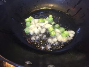 热油,8成热时将鸡块儿放入,炸至外表变干成深黄色后捞起待用。干辣椒和葱切成3厘米长的段,姜蒜切片。