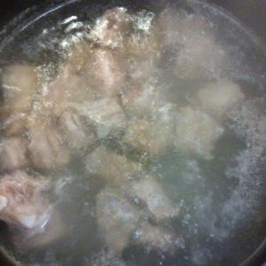 锅里上水,倒入肋排段,加入一勺半料酒 煮开,温水冲干净浮沫 沥干水待用