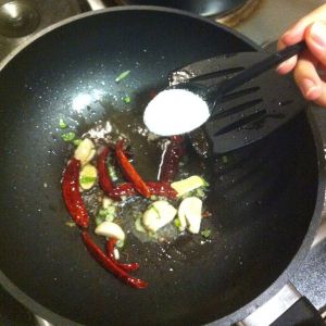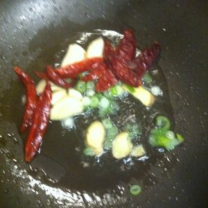 在油没有辣的时候放下辣椒 花椒 蒜 姜小炒